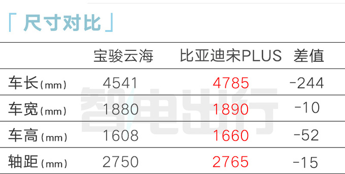宝骏云海整体尺寸略小于比亚迪宋PLUS。车内配备双幅式方向盘,搭载8.8英寸+15.6英寸智能悬浮双屏,全系标配灵眸智驾2.0 Max,包括智能行车辅助、高速领航辅助、城市记忆领航辅助、智能泊车辅助、主动安全。