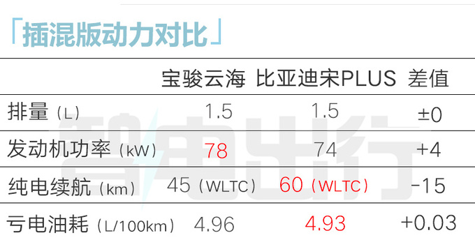 云海纯电版单电机最大功率150kW,CLTC纯电续航分别为500km和600km;插混版搭载1.5L插电混动系统,发动机最大功率78kW,提供60km与140km两个版本,WLTC工况下亏电油耗4.96L/100km。