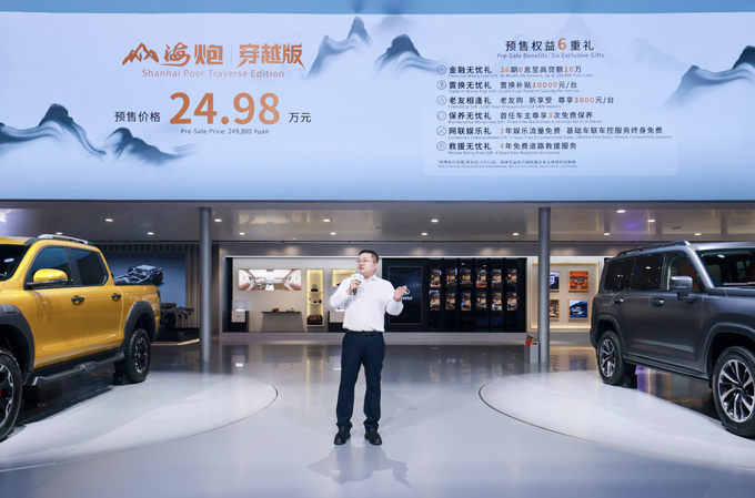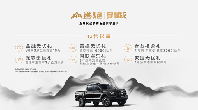 8月30日,“全球长续航高性能豪华皮卡”山海炮穿越版,在成都车展重磅开启预售,官方预售价为24.98万元。为让全球用户感受中国文化,山海炮穿越版推出“墨黑”、“金甲”两种车身颜色。预订用户还将享受“金融礼、置换礼、老友礼、保养礼、网联娱乐礼、救援礼”六重大礼,保障用户用车无忧。