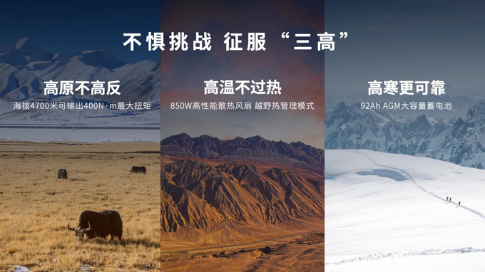 2.4T越野炮性能全面进阶,轻松应对高原、高温、高寒等极端环境考验。高原不高反,海拔4700米高原仍可输出400N·m最大扭矩,高原穿越无压力;高温不过热,专项配备850W高性能散热风扇,匹配行业首创越野热管理模式,炎炎夏日即使大负载长途穿越,也无需担心;可选装硅油风扇,实现发动机运行的动力最优、油耗最优、耐久最优;高寒更可靠,采用同级领先的AGM大容量蓄电池,容量高达92Ah,电容稳定性、低温可靠性更高,即使面对北方寒冬,冷启动也可以一键搞定!