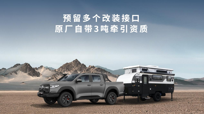 另外,新车采用高底盘设计,接近角30°、离去角26°,搭配360全景环视+透明底盘功能,通过性超强,不惧户外恶劣路况。预留多个改装接口,原厂自带3吨拖挂资质和拖车防摆功能,一车多用,拓展多样生活。