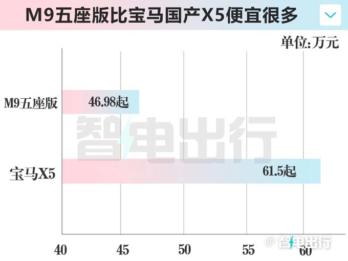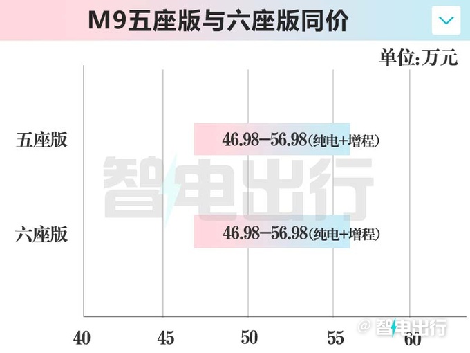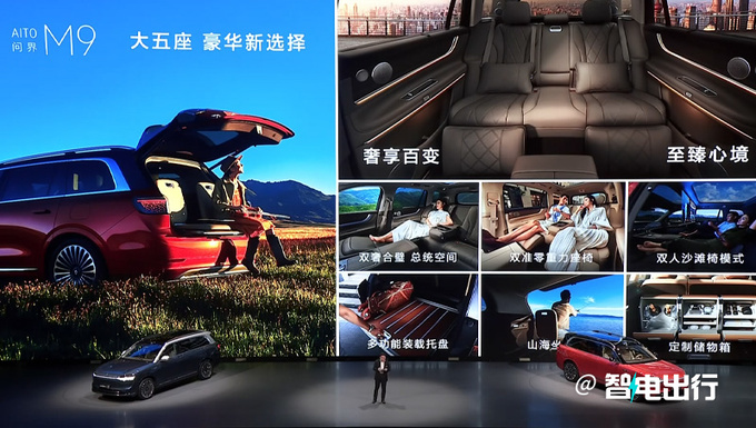 9月10日,问界M9五座版上市,2款增程版售价分别为46.98万元和52.98万元,纯电版仅提供Ultra版,售价56.98万元,与六座同价。问界M9五座版外观、尺寸与六座版一致,新增松露棕、琥珀棕内饰色,后备厢地板可选木材质,厢内配有收纳箱、桌板、“山海坐席”等。参加M9五座版先行者计划的用户将于10月1日前优先提车。