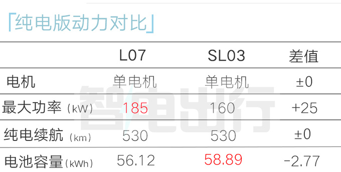 L07 1.5L增程器最大功率72kW,比SL03高2kW,驱动电机峰值功率160kW,匹配28.39kWh磷酸铁锂电池,标配3C快充,馈电油耗4.7L/100km;纯电版搭载185kW的单电机,配备56.12kWh电池组,纯电续航里程为530km。