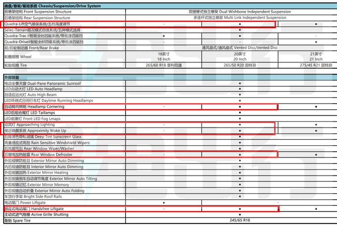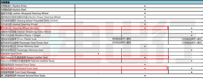 具体看,高峰版相比远峰版取消了空气悬架、自动转向照明、迎宾灯、接近唤醒系统、后窗电加热除霜、感应式电尾门、方向盘记忆、Nappa真皮座椅(换仿皮)、前排座椅通风、氛围灯和19扬声器音响系统。