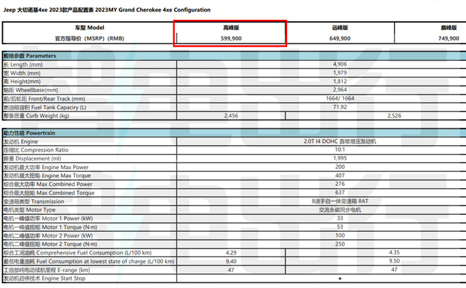 据说大切诺基4×e在9月20日会上市一款新的入门车型高峰版。新车官方指导价提前曝光,售59.99万元,比远峰版便宜了5万元。销售表示,这款车上市即降价,同样优惠20万,只卖39.99万元。