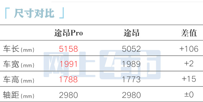 途昂Pro申报了第5代2.0T高功率发动机,最大功率200kW,匹配7速湿式双离合变速箱+四驱系统。预计2.0T低功率发动机动力比现款(330TSI)更强,尾标或将同步调整。