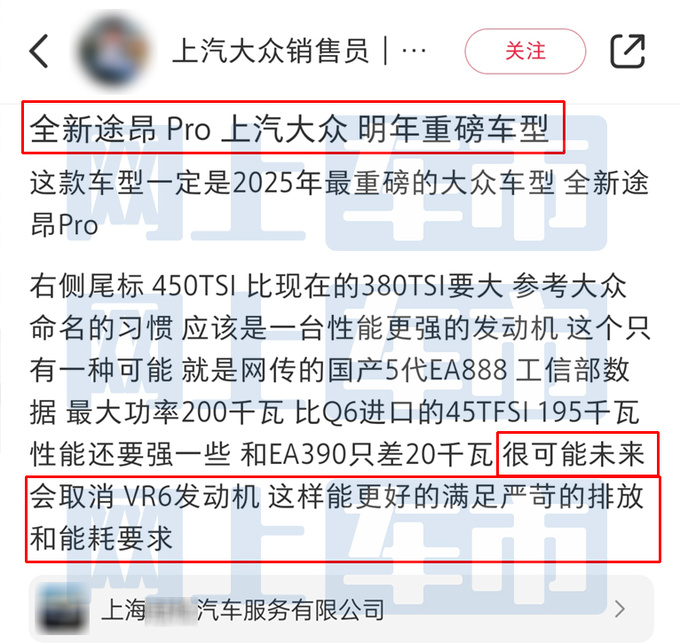 上汽大众经销商销售员表示,途昂Pro一定是2025年最重磅的大众车型,搭载的第5代EA888 2.0T发动机性能和现款2.5T六缸(EA390)只差20kW,未来很可能会取消VR6发动机。