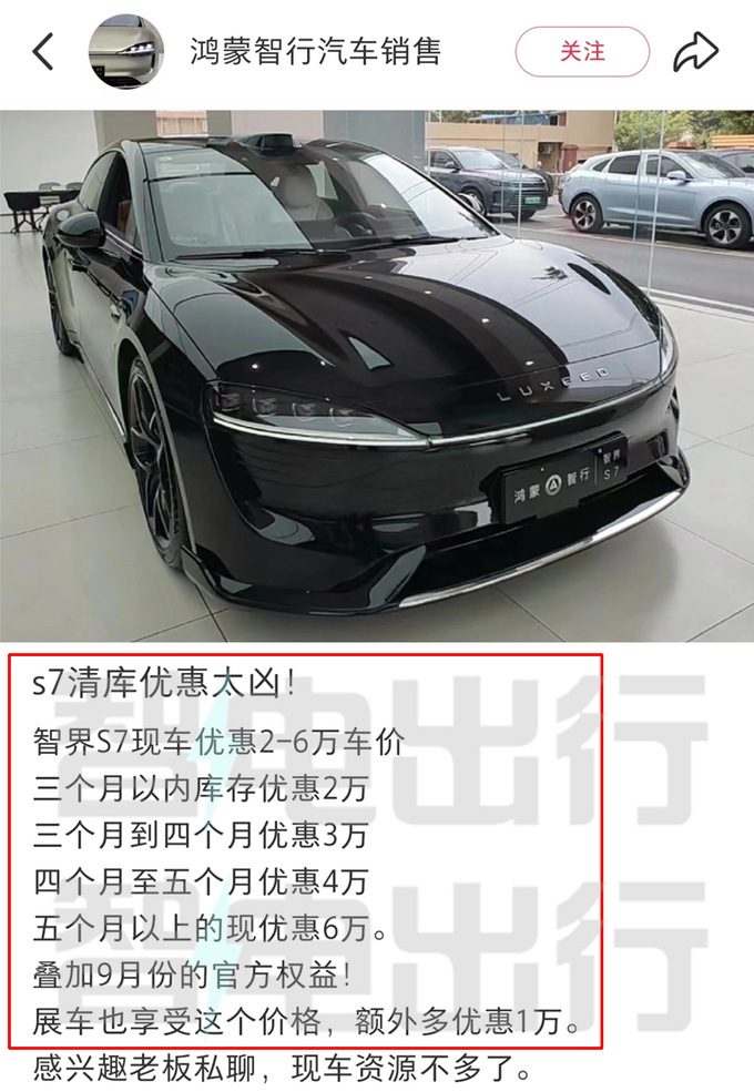 即便奇瑞和华为双方做出了许多努力,但智界S7这款车依然没有翻红。鸿蒙智行销售员表示,智界S7现车开始清库了,5个月以上的库存车现金优惠高达6万元,而且还能叠加9月份的官方权益!此外,展车也享受这个价格,额外多优惠1万元。