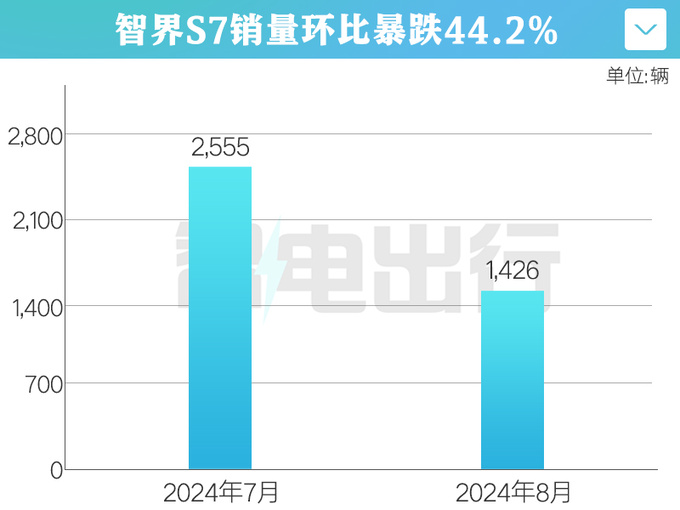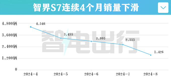 华为与奇瑞联合打造的智界S7,比享界S9便宜很多,8月份却只卖了1,426辆,环比暴跌44.2%,销量连续4个月下滑。