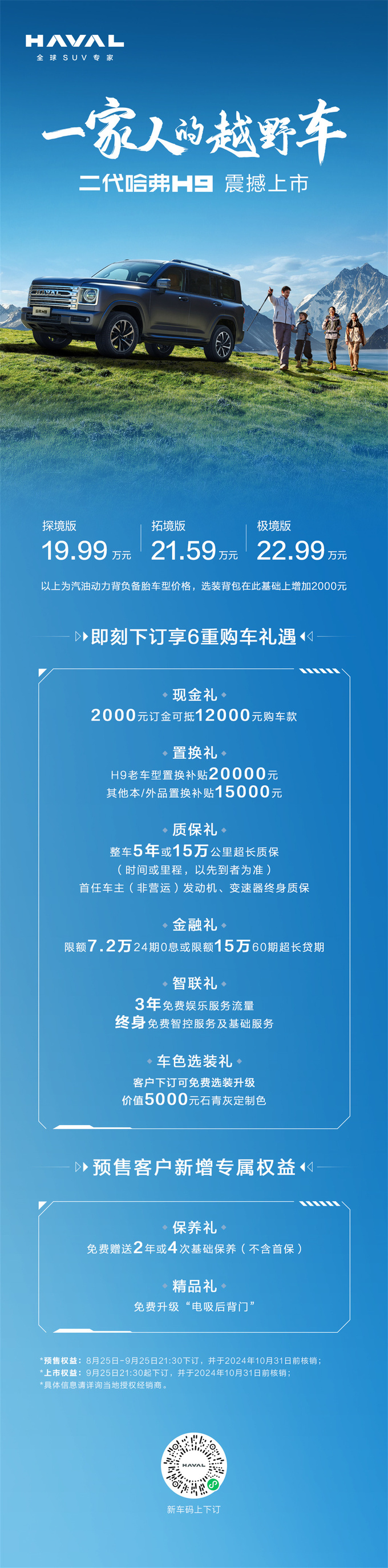发布会重磅宣布了二代哈弗H9的指导价,较预售价格全系下调6000元,其中,探境版指导价19.99万元,拓境版指导价21.59万元,极境版指导价22.99万元。用户即刻下定可享六重购车礼遇,分别是,现金礼:2000元订金抵12000元购车款;置换礼:H9老车型置换补贴20000元其他本/外品置换补贴15000元;质保礼:整车5年或15万公里超长质保加首任车主(非营运)发动机、变速器终身质保;金融礼:限额7.2万24期0息或限额15万60期超长贷期;智联礼:3年免费娱乐服务流量终身免费智控服务及基础服务;车色选装礼:免费选装升级价值5000元石青灰定制色。针对预售期间(预售下订截止时间:2024年9月25日21:30)下订购车车主,还额外赠送“4次基础保养+电吸后背门”大礼包,价值约3500元。诚意满满的权益福利,让每个追求高品质生活的家庭都能以更加轻松的方式,拥抱二代哈弗H9所带来的非凡体验与无限可能。