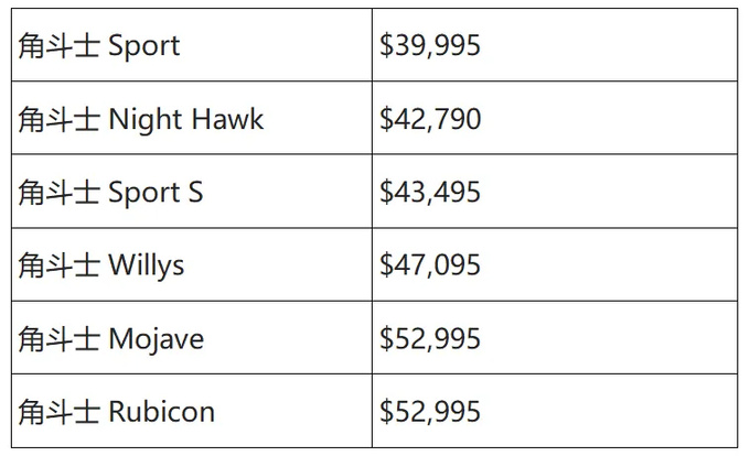 也因此,2025款角斗士的起售价变得更高。但考虑到变化,这个价格还是相当合理的。2025 款角斗士Sport起售价为39995美元,上涨了205美元。其中包括Jeep的1895 美元运费,与去年持平。角斗士的顶配车型Mojave和Rubicon的价格实际上下降了近2000美元。与Mojave X和Rubicon X相比,差价超过4000美元。2025款角斗士所有车型价格明细如下,其中已经包括运费。