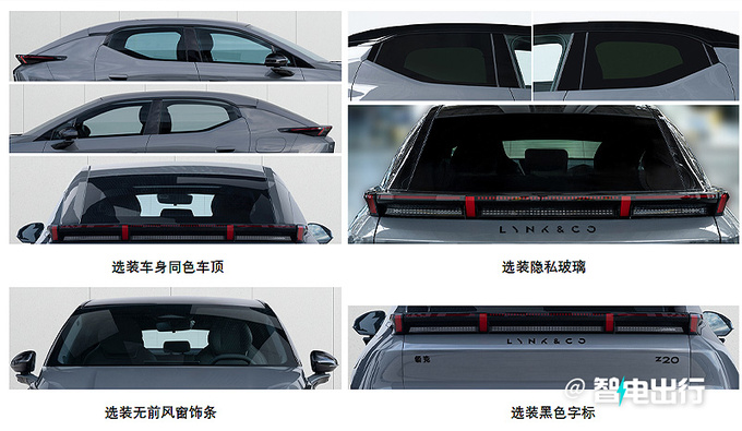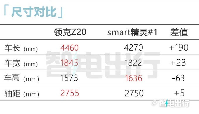 领克Z20整体尺寸比极氪X大一圈,车长、轴距也比smart精灵#1大。新车搭载The Next Day概念车日行灯造型,集示宽灯、日行灯、转向灯三大功能,采用无框车门设计,风阻系数0.25Cd,尾部配备全球首创尾翼式尾灯。