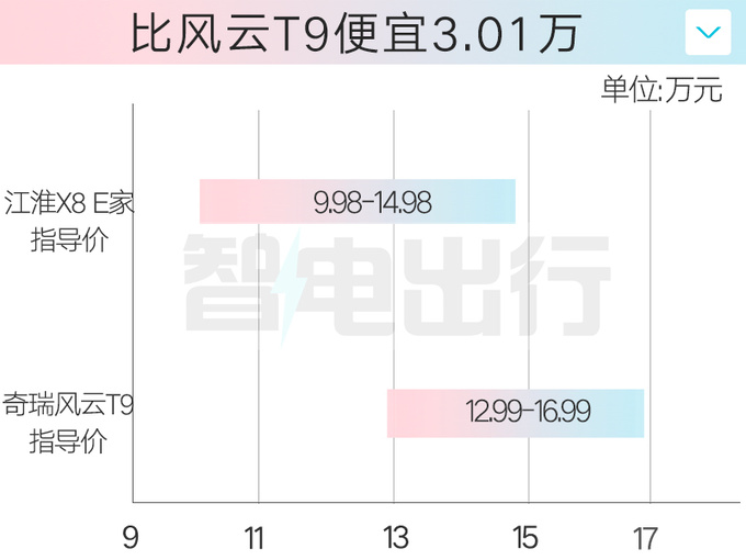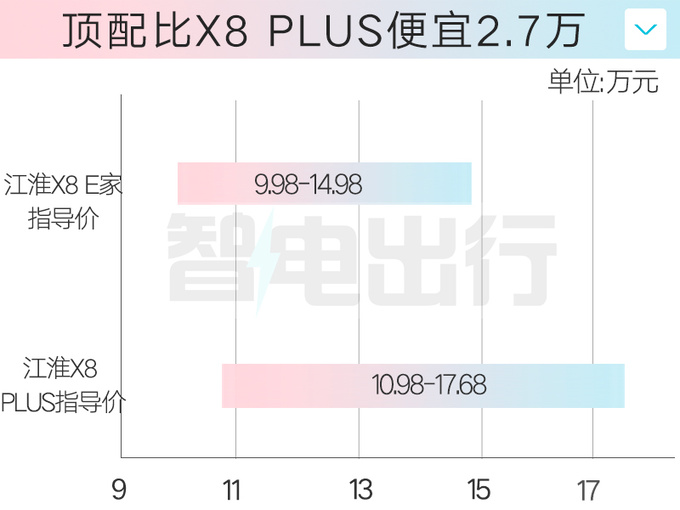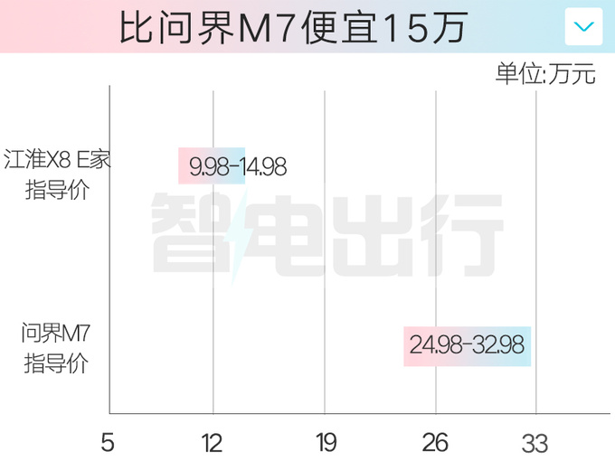 10月15日,江淮X8 E家正式上市,官方指导价9.98万元-14.98万元。新车尺寸与X8 PLUS相同,搭载东风重庆小康动力有限公司生产的型号为H15RT的1.5T四缸发动机,与华为问界M7一致。江淮X8 E家顶配比X8 PLUS便宜2.7万,起售比问界M7便宜15万,比竞品奇瑞风云T9便宜3.01万。
