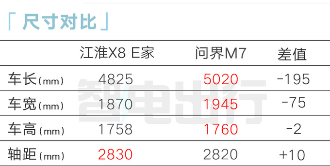 江淮X8 E家轴距比问界M7更大,提供5/6/7座3种座椅布局。车内搭载24.6寸智慧大屏、智能语音交互系统、智能远程管家系统、华为Hicar系统、讯飞全场景Ai语音,中央扶手配有二合一冷暖箱。