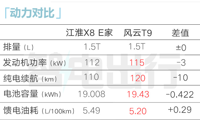 江淮X8 E家搭载1.5T发动机+单挡DHT变速箱,发动机最大功率112kW,电驱系统最大功率150kW,最大扭矩320N·m,CLTC工况下纯电续航110km、综合续航1100km,WLTC工况馈电油耗5.49L/100km。
