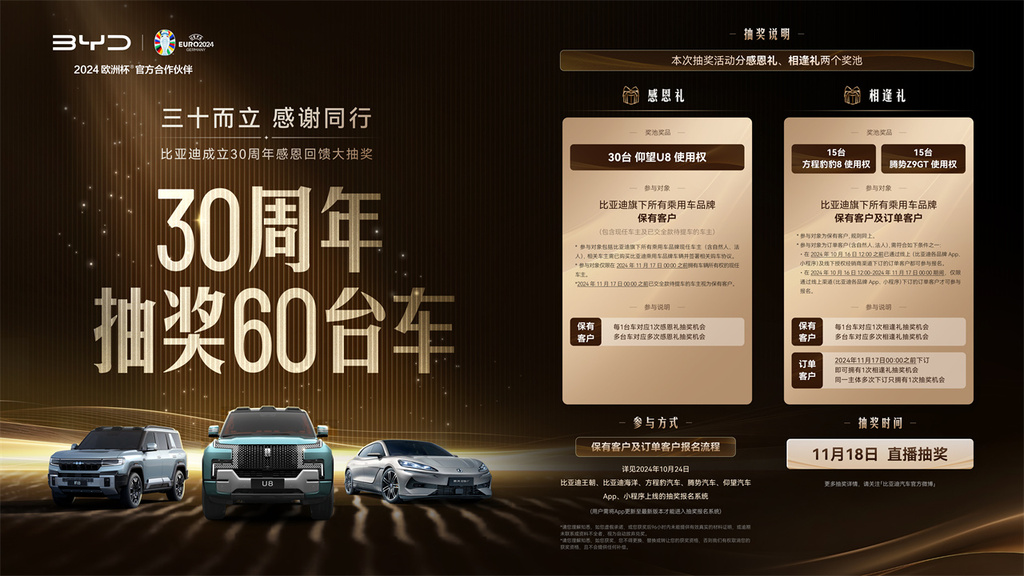 2024年10月16日12:00之前已下订的所有订单客户,及即日至11月17日0:00前,在比亚迪王朝、比亚迪海洋、方程豹汽车、腾势汽车、仰望汽车App或小程序完成下订的订单客户,都可参与抽奖。