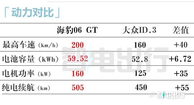 海豹06 GT后驱车型搭载160kW和165kW低/高功率电机,匹配59.52kWh、72.96kWh电池组,续航里程505km、605km;四驱车型搭载110kW+200kW前后双电机,匹配72.96kWh电池组,续航里程550km,动力与续航比大众ID.3更强。