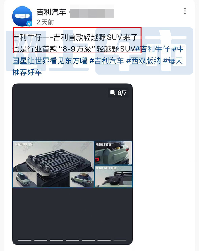 吉利牛仔采用方盒子造型,兼具越野SUV的风格和传统SUV的实用。销售表示,吉利牛仔是行业首款8-9万级轻越野SUV,将于近期上市。新车搭载8.8英寸液晶仪表+14.6英寸中控,内置魅族Flyme Auto车机系统,配备256色氛围灯。