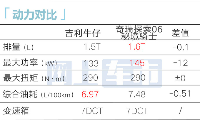 吉利牛仔搭载1.5T发动机,最大功率133kW,峰值扭矩290N·m,匹配7速湿式双离合变速箱,WLTC工况百公里综合油耗6.97-7.48L。
