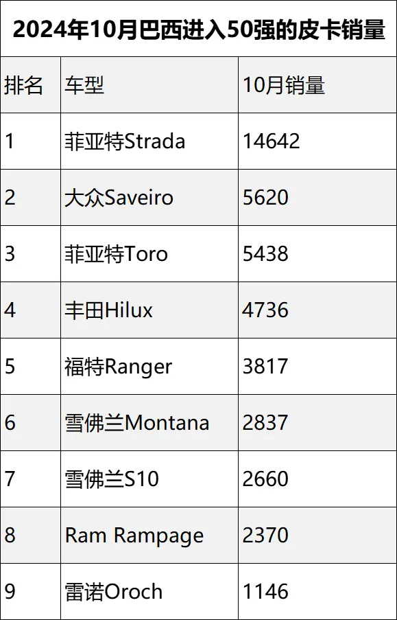 以下为巴西10月车型销量前50名中的皮卡车型具体表现。