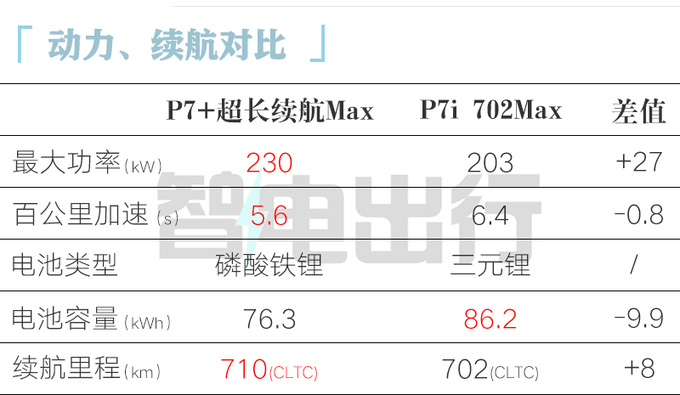 小鹏P7+搭载后置单电机,分为2种调校,分别匹配60.7kWh、76.3kWh磷酸铁锂电池,CLTC续航里程分别为602km、710km。