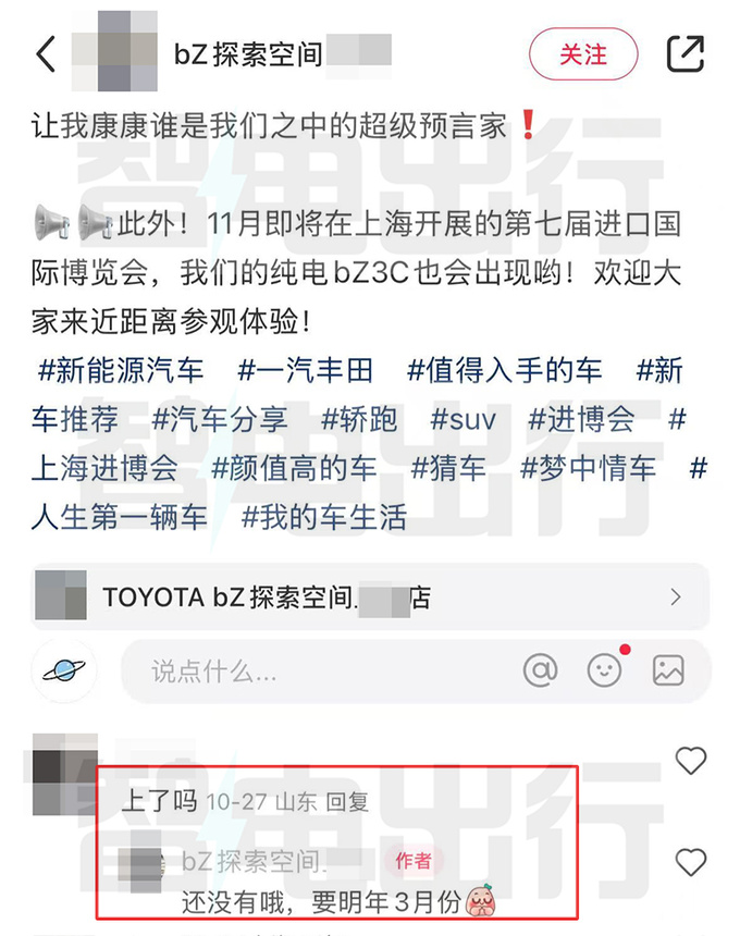 丰田bZ探索空间销售在社交媒体表示,bZ3C将在明年3月上市。新车轴距与bZ3相同,可视为其跨界版,搭载由比亚迪提供的电机与磷酸铁锂电池。