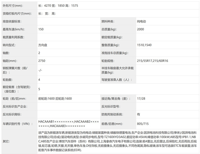新车搭载最大功率100kW驱动电机,最高车速150km/h,匹配中创新航/因湃科技生产的磷酸铁锂电池,整备质量分别为1510kg和1540kg。