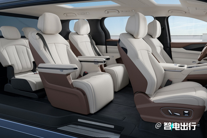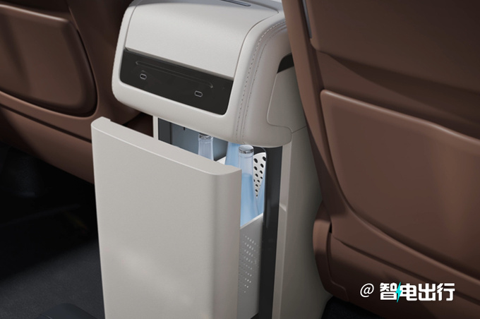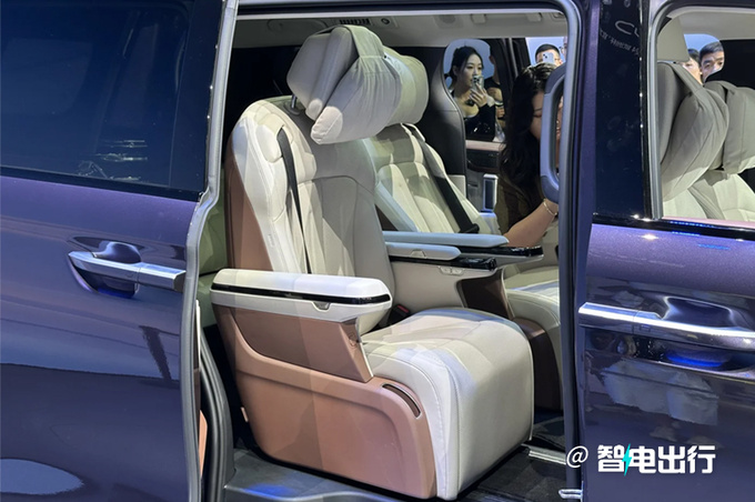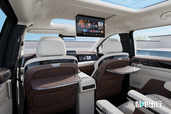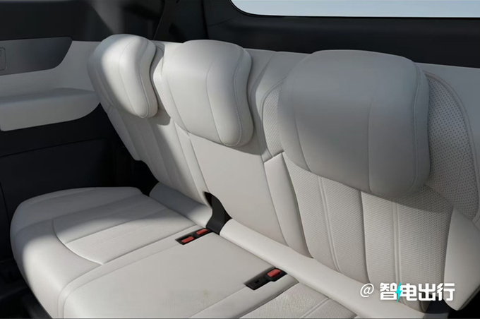 新车二排配备吸顶屏、独立压缩机冰箱、双侧小桌板,Nappa真皮座椅扶手和侧滑门带实体按键,可调节通风/加热/按摩/记忆等功能。第三排座椅可一键折叠、翻转放平,还能前后移动100mm。