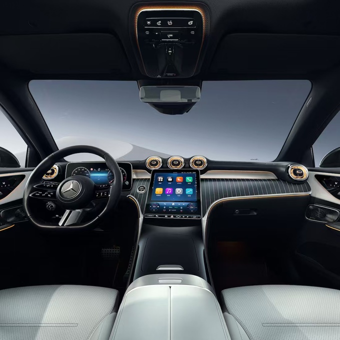 旗舰版车型新增MBUX超联屏,长达1.41米的一体式曲面玻璃设计贯穿主副驾。配备主动式环境氛围灯,可根据实时驾驶操作智能呈现动态流动效果,配合全系可选的Burmester®环绕立体声音响系统,营造迷人座舱氛围。