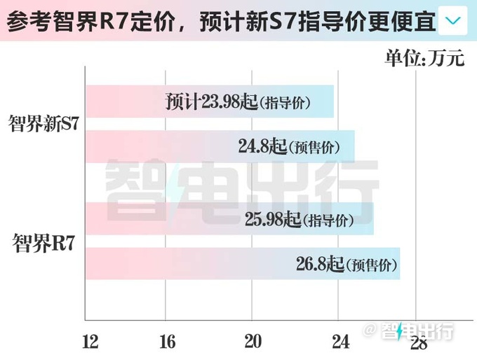智界R7指导价比预售价便宜8200元,预计智界新S7指导价也会比预售价便宜,入门版可能卖23.98万。
