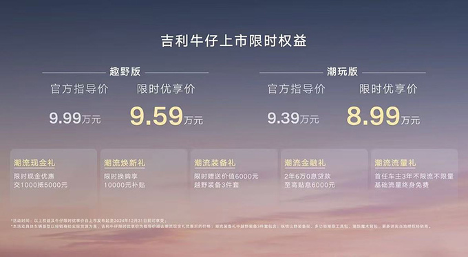 11月20日,吉利牛仔正式上市,2款车型官方指导价分别为9.39万、9.99万,较预售便宜2000元。新车定位轻越野SUV,采用魅族Flyme Auto智能座舱。
