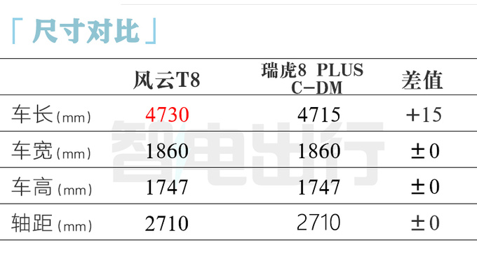 奇瑞风云T8采用与瑞虎8 PLUS C-DM相似的前脸设计,除车长外其它尺寸均相同,有5座/7座,搭载1.5T插电混动系统。