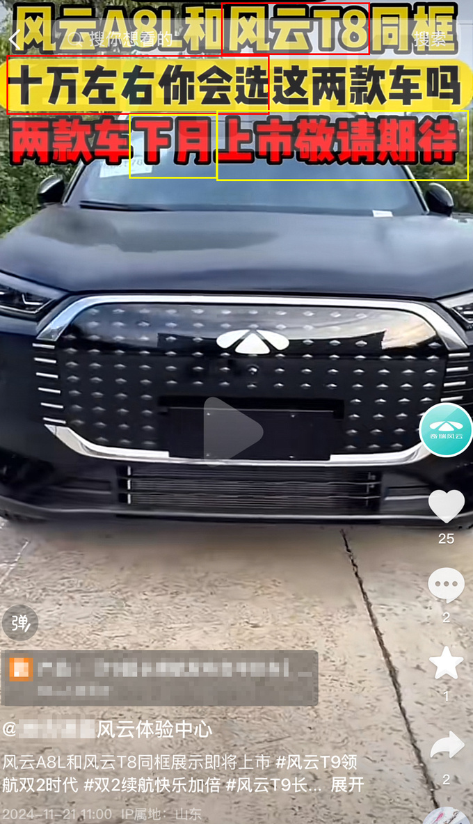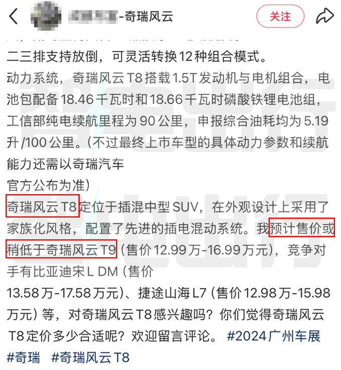 近期有风云体验中心的销售在社交平台发文,预计T8的售价或稍低于T9(12.99-16.99万),竞品包括了比亚迪宋L DM-i、捷途山海L7等?;褂邢鬯礣8下个月就上市,十万左右你会选吗?