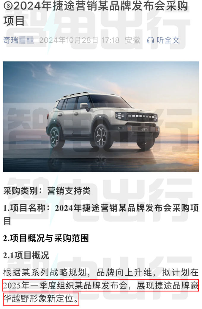 捷途营销某品牌发布会采购项目显示,2025年一季度组织某品牌发布会,展现捷途品牌豪华越野形象新定位。预计定位百万级全域旅行SUV的山海T7会是这个系列的首款车型,有可能会一同发布。