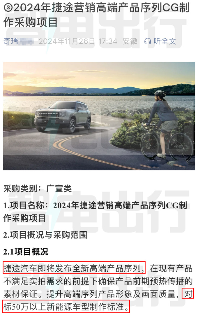 奇瑞正在对2024年捷途营销高端产品序列CG制作采购项目进行招标。从项目概况来看,捷途汽车即将发布全新高端产品系列,对标50万以上新能源车型。