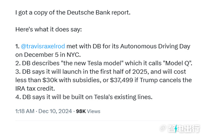 日前据特斯拉投资者关系主管Travis Axelrod透露,特斯拉旗下Model Q入门级纯电动车型,计划将在2025年上市开售,价格在联邦税收抵免下将低于30,000美元(约为22万人民币)。同时,新车也有望在明年于国内市场陆续开启新车投产工作,预计市场起售价将降低至20万元人民币以下,同级主要竞争对手包含了比亚迪秦PLUS、小鹏MONA M03以及AION S等车型。