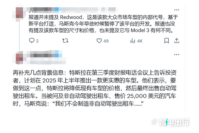 另据特斯拉一份报告显示,其中没有提到Redwood(早期消息为Model Q车型代号),而马斯克在今年早些时候也暂停了该平台的开发,同时报告中也没有提到尺寸和成本,也没有提到它与Model 3有何不同;这也预示着新车将基于现有车型平台进行打造。