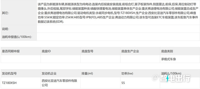 新车尺寸与现款一致,标配16英寸轮圈,搭载最大功率55kW驱动电机,最高车速130km/h,匹配弗迪磷酸铁锂电池,CLTC工况续航405km(参考现款顶配)。