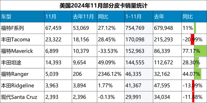 环比10月来看,本月微增0.3%。丰田Tacoma越战越猛,再次收获一个增长月,而一路高歌猛进的福特Maverick则遭遇不小的下滑。无论是同比还是环比,丰田Tacoma都很开心,福特Maverick则失意连连。
