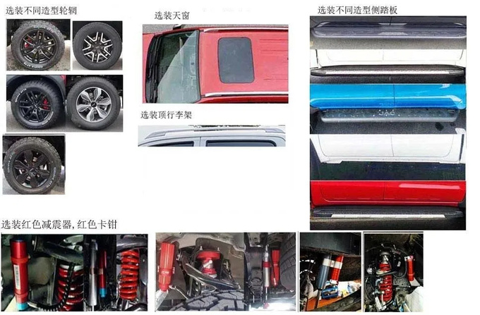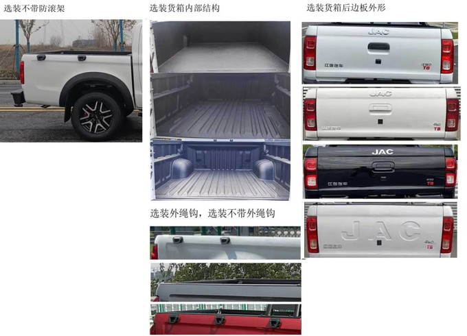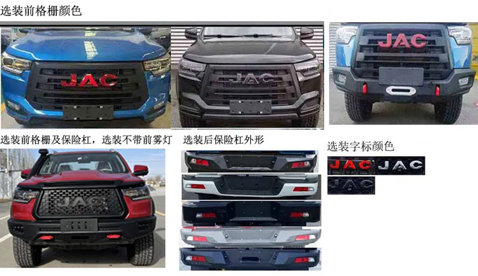 新款江淮T8可以选装2种前格栅样式。一种是常规的横幅式格栅,一种是点阵式前格栅。后保险杠样式也有多种可选,字标颜色有红色、银色和黑色可选。除此之外,还可以选装天窗、侧踏板、车顶行李架、红色螺旋弹簧、红卡钳、轮辋、涉水喉、前雾灯、防滚架、外绳钩、货箱后边板外形、货箱内部外形、车载ETC装置等等。从这些选装配置可以看出,越野配置还是比较多的。