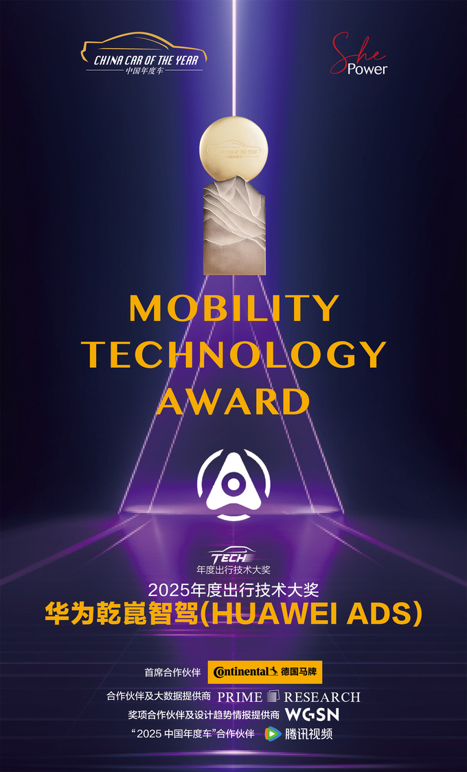 鉴于出行技术的多样性,覆盖领域更加广泛,因此经过评委们的投票,今年共选出2项技术获得“2025年度出行技术大奖”。分别为:华为 乾崑智驾 HUAWEI ADS、吉利 神盾短刀电池技术。
