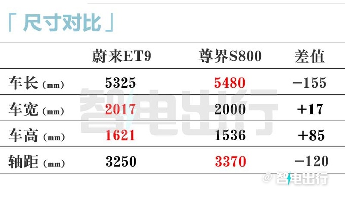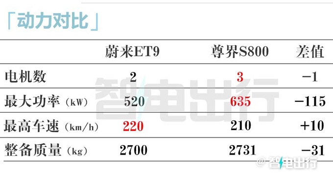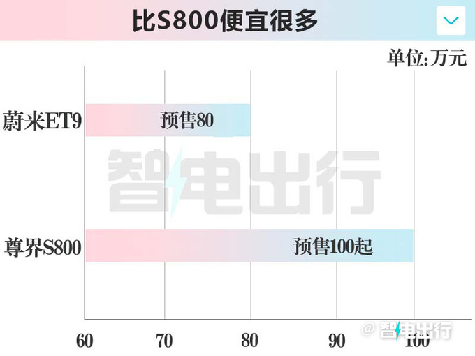 ET9基于NT3.0平台打造,定位4座行政级轿车,预售价80万元,搭载全线控智能底盘、神玑NX9031 5nm车规级智能驾驶芯片、全新900V高压架构及全域操作系统SkyOS·天枢等新技术。车长、轴距虽然比尊界S800小一些,但价格便宜很多。