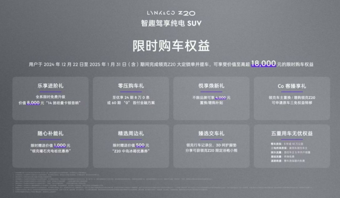 12月22日,备受瞩目的领克Z20正式在上海完成国内上市,售价区间为(限时领享价)13.59万元-15.09万元(上市限时价)。匹配的上市福利包括:在 2024年 12月22日至2025年1月31日(含)期间完成大定锁单并提车,可享受价值至高超18,000元的限时购车权益。
