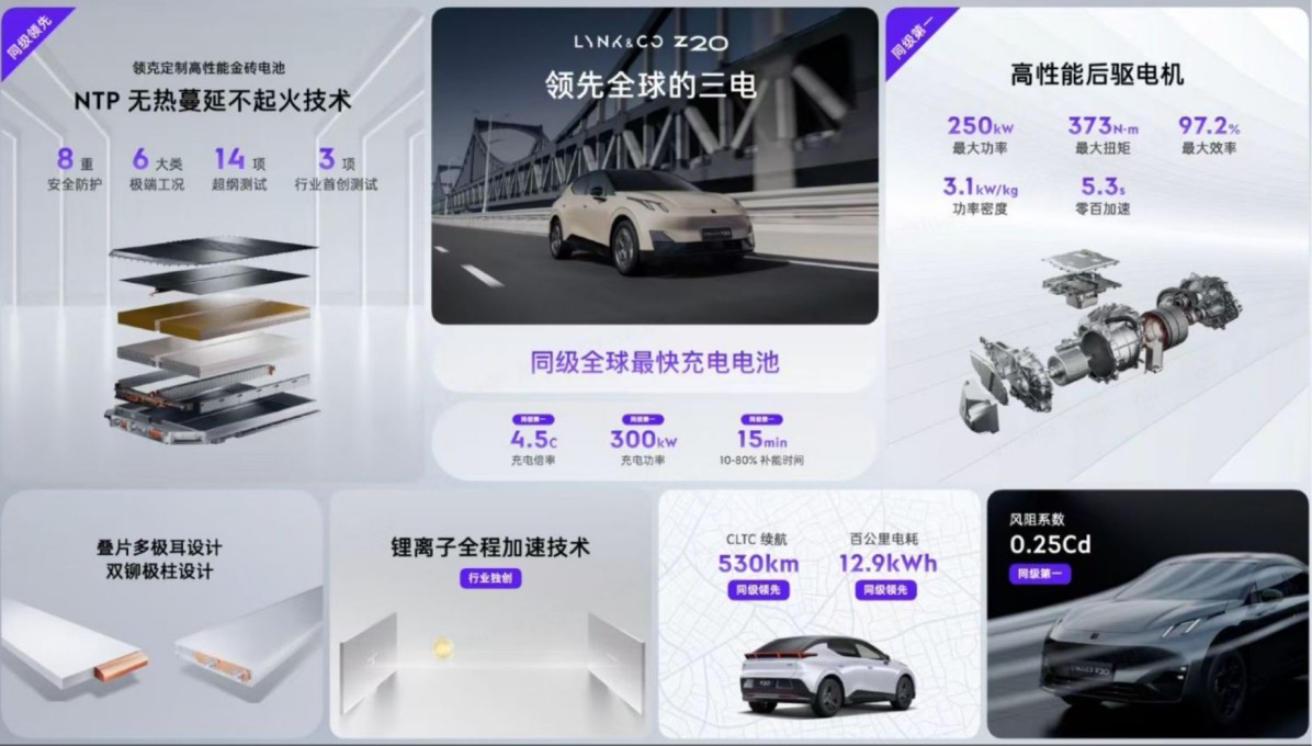 再加上明显的外观设计不同、轴距调整的结构不同、优化的空间体验不同,以及最根本的就是金砖电池配4.5C超快充的组合,让领克Z20明显成为了一台全新的同级车型。