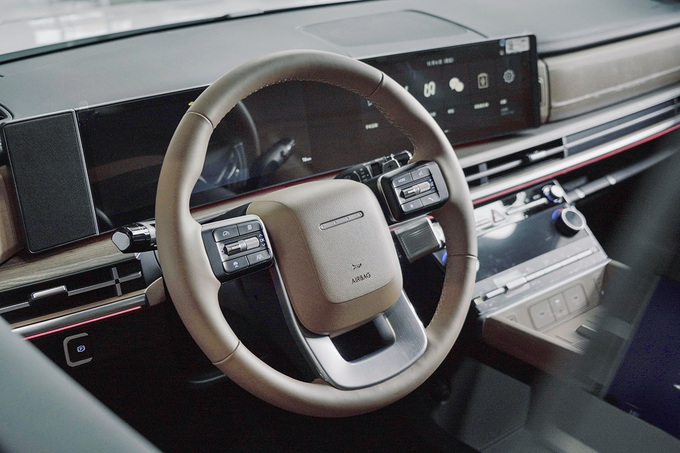 我们今天主要体验的这台车是指导价21.88万元的探索家Pro,同时店里还有一台配置更高的鉴赏家版本。能够看到两车在外观细节处的设计略有不同,特别是中网部分,一个是偏内敛的横向矩形排布,另一个则是采用更运动的矩阵网状设计。这两种前脸各有特点,可以根据自身喜好去选择。