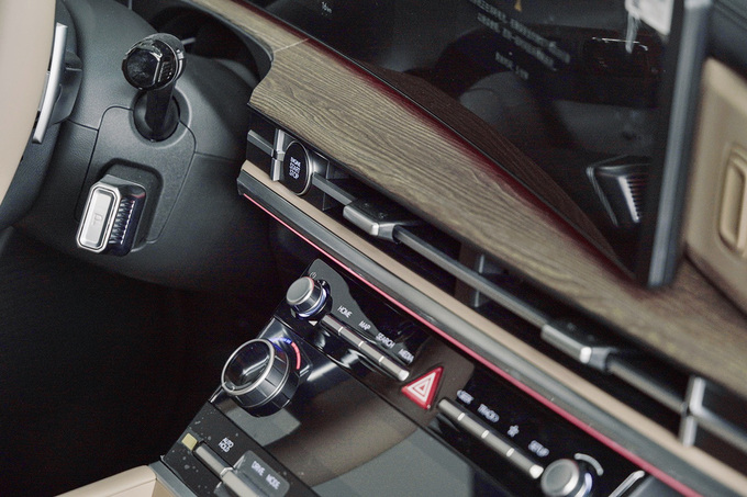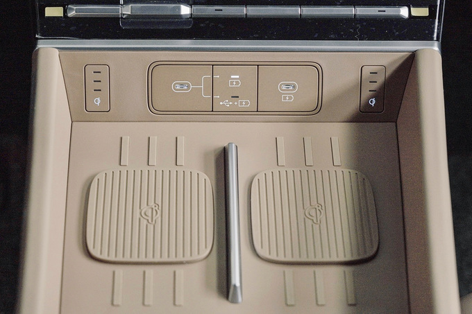实拍车辆前排配备了大量可为电子设备充电的???,仅空调控制面板下方就设有两个无线充电面板和两个Type-C接口,就连前排座椅后方也设有充电接口,所以对于重度手机使用者来说,即便是车内满员的状态也不用担心充不上电的情况。