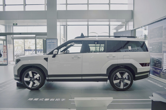 来到车身侧面,平直的线条和多种颜色的搭配使这款车具有丰富的视觉层次,外抛的轮拱将第五代胜达的力量感展现得淋漓尽致,再搭配悬浮式车顶设计,为整车增添了几分时尚气息。车身尺寸方面,新车的长宽高分别为4830*1900*1780,轴距为2815mm,这样的尺寸保证了车内的充足空间。