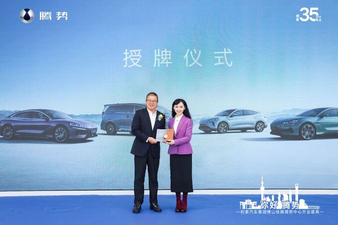 腾势汽车副总经理龙梅向利泰集团董事长江黎明授牌,标志着双方合作的新篇章正式开启。