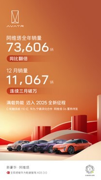 2025年1月1日,阿维塔科技宣布,全年销量73606辆,同比翻倍,增速领跑行业。其中,12月销量11067辆,连续三个月破万。同时,阿维塔在品牌、产品、渠道、海外、技术、融资等领域,均取得了突破性进展,为未来发展集聚了强劲势能。