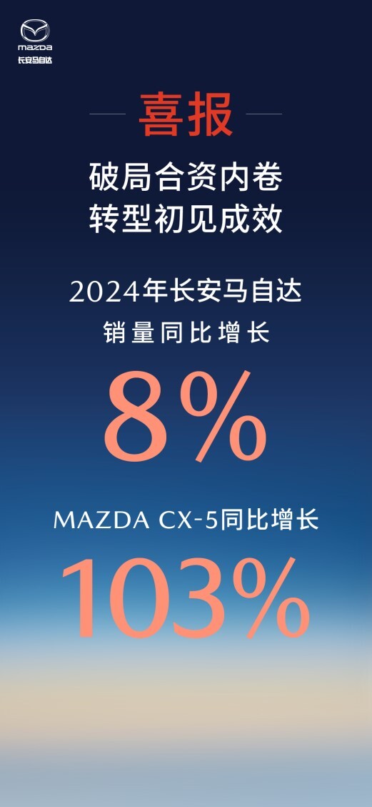 新年伊始,长安马自达公布了2024全年销量成绩,销量较上年实现同比增长8%,其中MAZDA CX-5同比增长103%。面对国内汽车市场白热化的内卷竞争与严峻挑战,长安马自达坚定推动新能源转型的同时,紧跟市场脉搏,持续焕新产品竞争力,以多元化的营销举措回馈用户需求,坚持以高价值驱动自身发展。